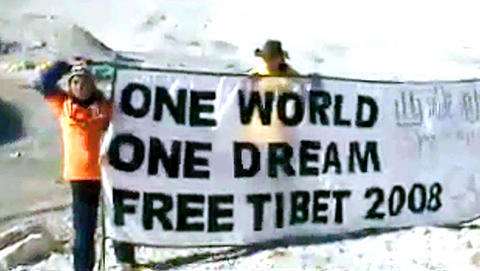 The protest was organized by Students for a Free Tibet, which said three people were taken away after holding up a banner at a base camp on the Tibetan side of the mountain that said "One World, One Dream, Free Tibet 2008."