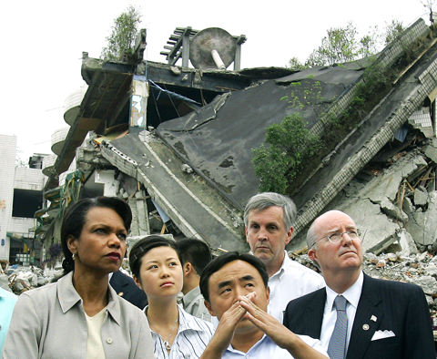 Rice arrived in Beijing after touring China’s earthquake shattered Sichuan Province.