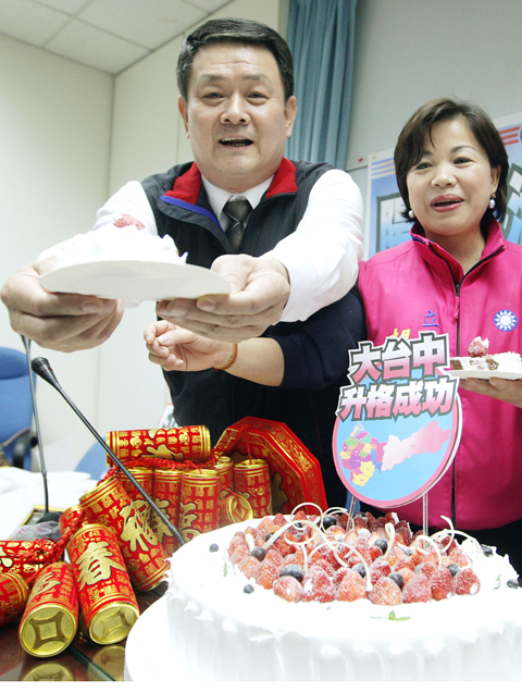 “We are happy to see upgraded status for a merged Taichung City and Taichung County, but we hope the KMT will support mergers for Tainan City and Tainan County, and Kaohsiung City and Kaohisung County and elevate both of them to special municipalities as well,” DPP Legislator William Lai (賴清德) said.