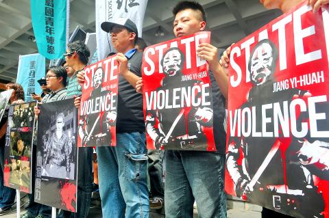 “Mastermind behind the violence. Abuser of democracy. Face the trial. Jiang Yi-huah, step down,” more than 100 demonstrators affiliated with several civic groups, including Taiwan March and the Black Island Youth Front, shouted as Jiang, as well as National Police Agency Director-General Wang Cho-chiun (王卓鈞), Taipei City Police Department Commissioner Huang Sheng-yung (黃昇勇) and Zhongzheng First Police Precinct Chief Fang Yang-ning (方仰寧), arrived at the Taipei District Court as defendants.