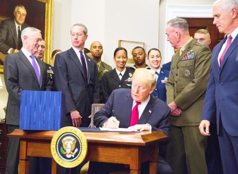 The Presidential Office yesterday thanked the US after US President Donald Trump on Tuesday signed into law the National Defense Authorization Act (NDAA) for Fiscal Year 2018, which contains provisions favorable to Taiwan’s defense, while China voiced opposition to Taiwan-US military exchanges.