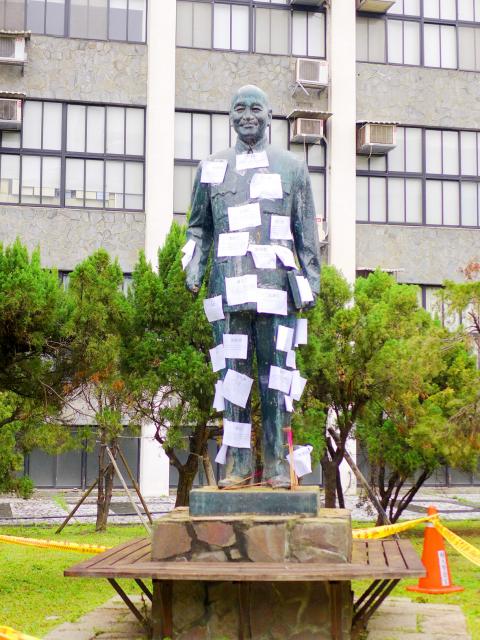 Investigators quoted one of the students, surnamed Lo (羅), as saying during questioning that “the statue of Chiang Kai-shek symbolizes the past authoritarian dictatorship. It should not continue to stand inside schools. We just wanted to remove it.”