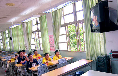 In a dimly lit classroom, the Chunghsueh Elementary School (