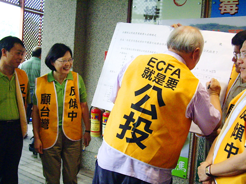 In related news, DPP Chairperson Tsai Ing-wen (蔡英文) urged the public to sign a petition asking the government to hold a referendum on the ECFA issue during a visit to Kaohsiung City yesterday.