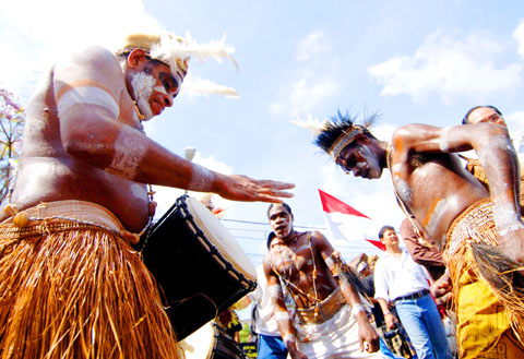 The protest took on a carnival atmosphere with Western-style music and dancing by Papuan tribesmen wearing only traditional penis sheaths, body paint and headdresses made from leaves.