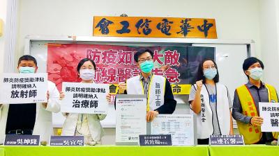 About 100 taxi drivers yesterday protested in front of the buildings housing the Central Epidemic Command Center (CECC) and the Ministry of Transportation and Communications (MOTC) in Taipei, demanding that the government ensure sufficient supplies of COVID-19 rapid test kits for drivers. The government launched a rapid test kit rationing scheme on April 28, fixing the price at NT$500, with each kit containing five rapid tests. However, supplies are limited, with long lines forming at pharmacies that sell them. On Thursday last week, some supermarkets and other retailers also began selling COVID-19 rapid test kits for NT$180 apiece, but many have complained about the price. The protest was organized by the Taipei City Taxi Drivers’ Union and an industrial union representing shuttle service by appointment on digital platforms. Peng Chih-yuan (彭芝園) from the industrial union said that other countries provide the kits to citizens for free, while the Taiwanese government “sells them for NT$180 per kit.” KiKi, a self-employed taxi driver, said she used to earn about NT$1,000 to NT$2,000 working eight hours a day, but now works about 24 hours a day, but only earns about NT$500 to NT$600. Passengers would ask her whether she had taken a rapid test, and would complain if she said no, KiKi said. They would ask “Why don’t you have a test since you have contact with so many people?” or “How can you prove that you are virus-free without taking a test?” she said. The protesters said that some passengers would even get exit their cab and take a bus or walk home because they considered it too dangerous. Aside from testing kits, many drivers have encountered difficulties buying antipyretics and can only drink salted water when they have a fever. Taxi driver A Mu (阿沐) said that he lives with his 80-year-old father, 75-year-old mother and a second-grade son,