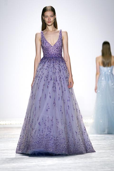 Designer Monique Lhuillier played with different dress lengths and incorporated metallics, tulle, sequins, lace and silk crepe in her collection that was inspired by the sunrise.