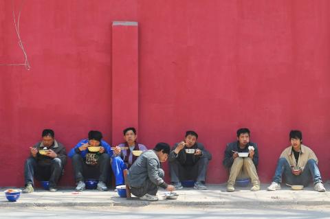 A group of Chinese workers have lunch by a road in Beijing, China, on Tuesday last week.