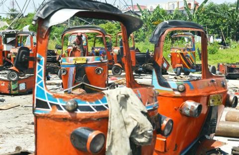 A worker cuts up Indonesian rickshaws known locally as “bajaj” for scrap metal at a junkyard in Jakarta yesterday as owners traded in their old vehicles to the transport agency for more environmentally friendly newer models. The Indonesian Transport Agency is targeting 14,424 units as part of a phaseout program to introduce the newer models.May 08, 2013