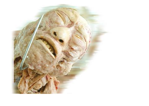 In one airy room, skinned corpses wrapped in white cloth and covered in plastic lay stretched out on tables, surrounded by ``dissectors'' -- many of them medical students. They hunched over the bodies, picking out fat and tissue with tweezers. In another area, bodies hung ``curing'' with gas, light or heat.