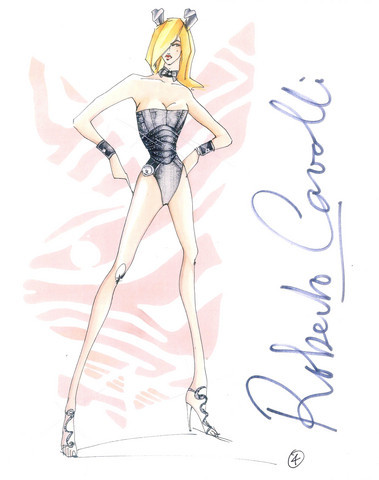Cavalli has added an external corset, softened the stays and the bosom, raised the leg line to reveal more hip and elongated the bunny ears, giving them a playful droop.