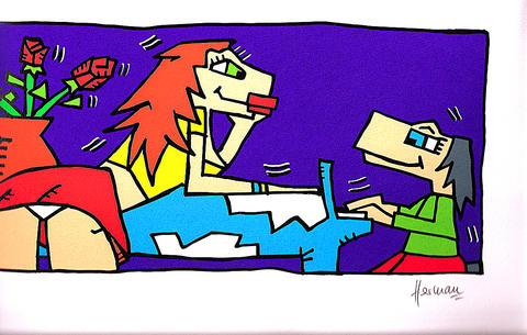 His paintings have a rough, simplistic look, but are full of verbal and pictorial humor. A professional cartoonist, Herman gave up his battle against the big cartoon syndicates, and decided to adopt a style of drawing that would differentiate him from the smooth, fluid lines of comic strips such as Garfield and Alfie.