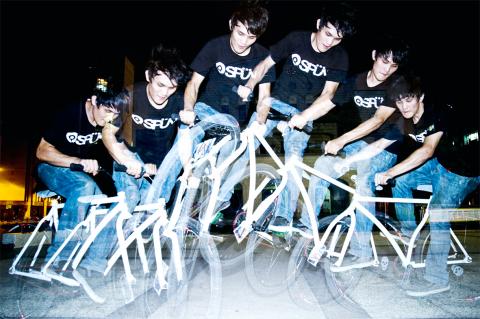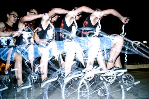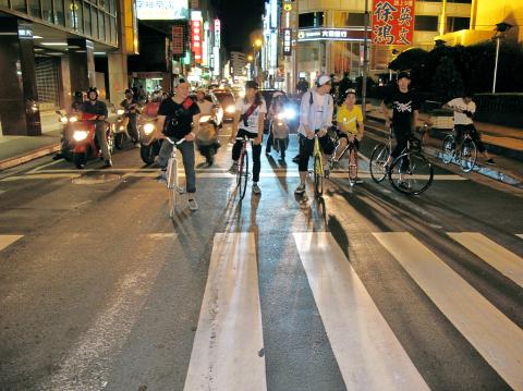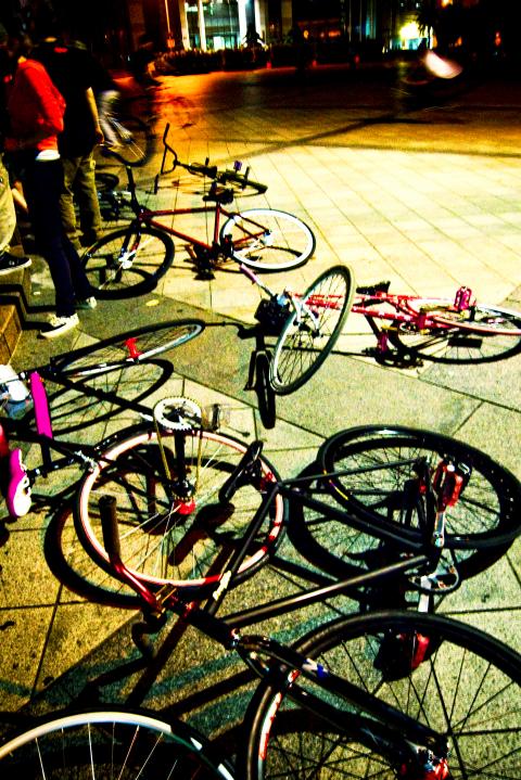 Many of Taipei’s best-known cyclists gathered outside Ximen MRT Station (西門捷運站) on a recent Saturday night. Peng Wen-yan (彭文彥), better known as A-bao (阿寶), arrived with his team Skunk. Members of the Nabiis (www.nabiis.net), a pioneering fixed-gear bike group, looked agile in their professional outfits, while riders from BreakBrake 17 (breakbrake17.com) were in high spirits after winning the trick competition held outside Zhongshan Hall (中山堂) earlier that day.
