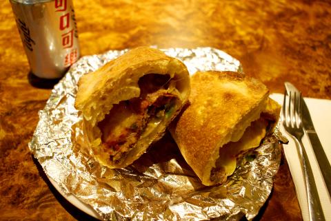 Stromboli is a turnover pizza similar to a calzone, but its dough is thicker. Chen said calzones are often made with ricotta, whereas Stromboli are made with mozzarella. The base is a vegetarian combination of onion, green pepper, tomato sauce and cheese, to which I added pepperoni and sausage (NT$320).