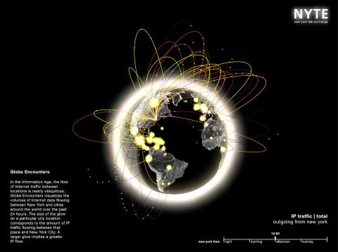 Possible answers lie in several works on display at the international Digital Art Exhibition. New York Talk Exchange, for example, is a project by Senseable City Lab at the Massachusetts Institute of Technology (MIT) that illustrates the daily life of New Yorkers by analyzing large volumes of long-distance telephone and IP data flowing between New York City and other metropolises around the world using data visualization.