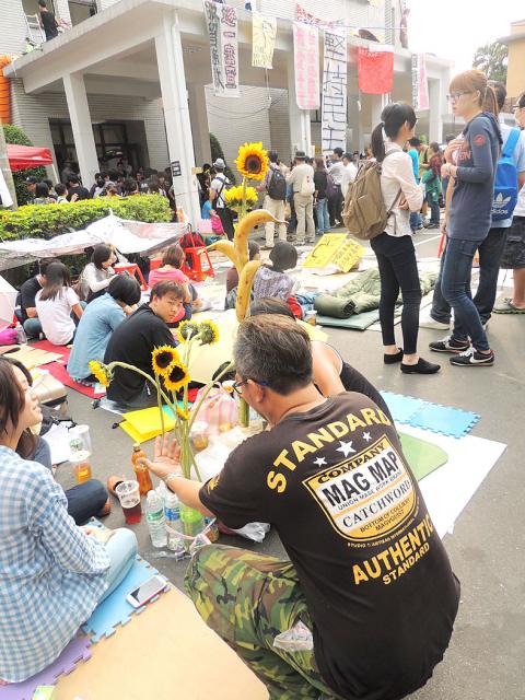 They were inspired by the sunflower, a heliotropic plant that students adopted as a metaphor for transparency. Other early works were caricatures of President Ma Ying-jeou (馬英九), drawn in emperor’s clothing or with deer antlers, a reference to a moment earlier this month when Ma mistook deer antler velvet (鹿茸) for deer fur.