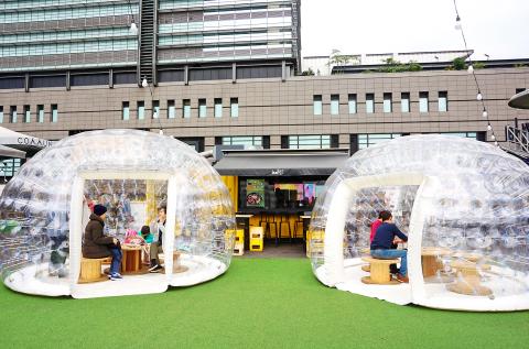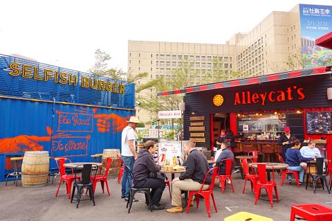 Commune A7 might leave foodies scratching their heads. Opened last December in Taipei’s posh Xinyi District (信義) as an outdoor food market, the entrance is sandwiched between an electronics showroom and a car showroom, both of which have cafes inside — just in case patrons wish to dine next to the latest Mercedes-Benz.