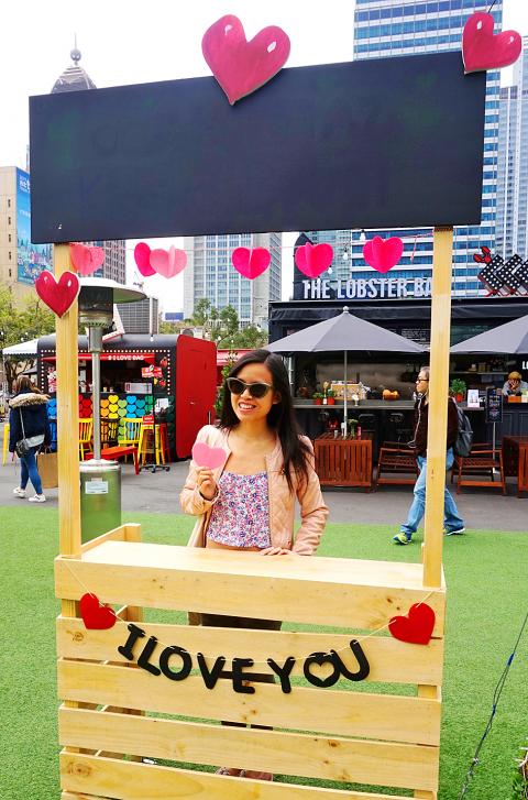 We are seated at a regular outdoor picnic table, but around us are some interesting seating arrangements — there are pink swings made for two and giant bubble houses with small wooden chairs and tables inside. Of course, all of this also lends well to photography and most patrons are taking selfies instead of eating their food. In case that isn’t enough photo opportunities, some food stands even provide props — mostly cardboard cut-outs — for customers to pose with.