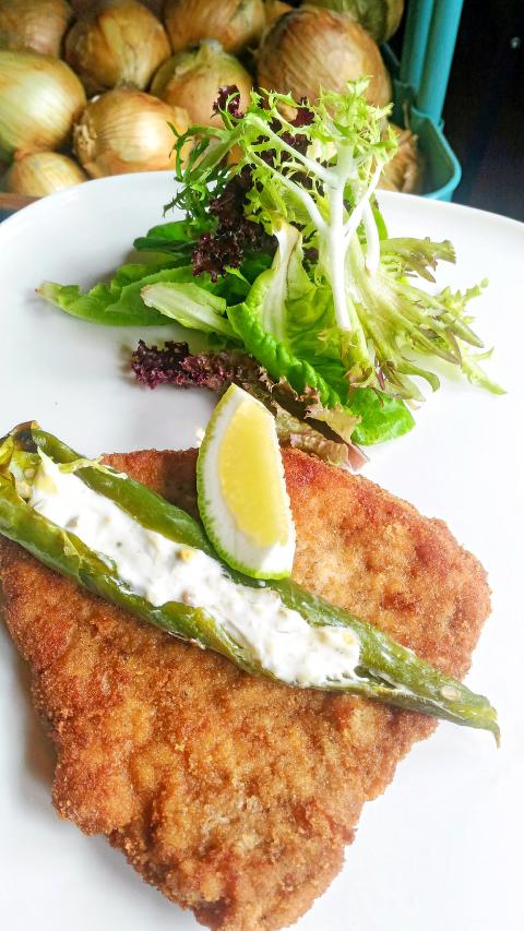 Wiener schnitzel is a much abused dish which doubtless has its grand traditions, but I am perfectly happy to put these aside in the interests of convenience and the consumption of breaded meat. The pork available in Taiwan is perfectly serviceable, and indeed delicious, substitute for the traditional veal, and while copious quantities of butter do indeed impart a luxurious richness to the final product, good, clean vegetable oil is easier to use and produces a result that is very acceptable without the danger of burnt butter. I generally have a quantity of strained yogurt in the fridge, which I usually salt for longer life, which is excellent for cooked dishes such as the stuffed chilies. It can get quite tangy, but for me this is part of the appeal. Feel free to use strained yogurt of more recent vintage. A good strong yogurt is a great counterpoint to the slight pungency of the chilies, and the bacon and cheese provide lovely depth of flavor, and the whole thing mashed over the breaded meat is one of my own perfect comfort foods.
