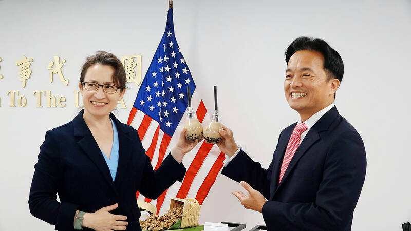 Representative to the US Hsiao Bi-khim, left, and Deputy Representative to the US Cheng Jung-chun raise bulbs of bubble tea at a news conference at the Twin Oaks estate in Washington yesterday. The representative office in the US is to hold an event on Wednesday introducing Taiwanese food as part of a National Day celebration.