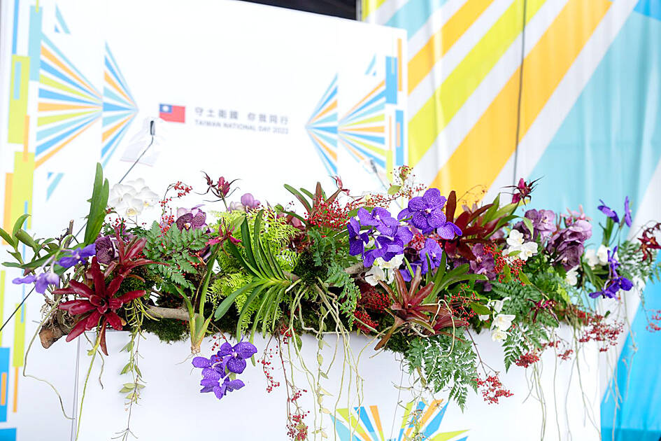 Floral arrangements for this year’s Double Ten National Day celebration incorporated the beauty and cultural significance of Taiwan’s ecology, the Taiwan Florists’ Transworld Delivery Association said, adding that it worked with the Council of Agriculture to use an image of Taiwan as the framework of the design.