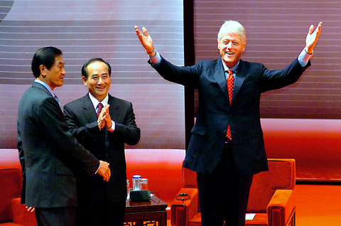 Clinton's speech was delayed for about an hour because his flight could not land due to bad weather. Accompanied by Legislative Speaker Wang Jin-pyng (王金平), he walked into the packed auditorium of the TICC at 7pm. The audience stood and chanted greetings in Chinese to the former US president.
