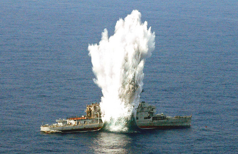 The drill was conducted in waters off Hsiao Liuchiu (小琉球), an island off the southwest coast. The Jianlong-class submarine launched the torpedo at 9am and hit the target in a violent plume of water. Chen and the other officials cheered as the torpedo hit the target.