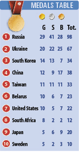 Second and third in terms of gold medals were Ukraine and South Korea, with 20 and 14 medals respectively. Taiwan ranked fifth with 33 medals in total — 11 gold, 11 silver and 11 bronze.