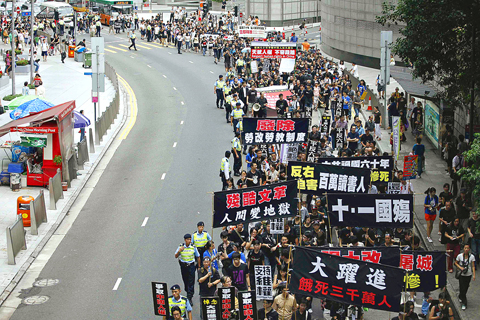 Celebrations began in the morning with troops firing cannons and raising the red national flag while President Hu Jintao (胡錦濤), wearing a slate grey “Mao” suit, looked on from the Gate of Heavenly Peace.