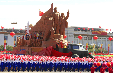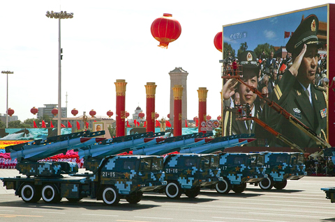 China celebrated its wealth and rising might with a show of goose-stepping troops, gaudy floats and nuclear-capable missiles in Beijing yesterday, 60 years after Mao Zedong (毛澤東) proclaimed its embrace of communism.