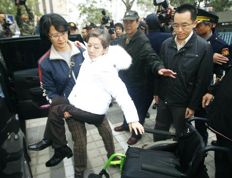 The Kaohsiung Prosecutors’ Office ordered Wu’s son, Greater Kaohsiung Councilor Chen Chih-chung (陳致中), to take his wheelchair-bound mother home after a medical team at Pei Teh Hospital concluded that Wu was not well enough to serve her sentence.
