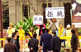 Carrying large banners that read “Unification is a [dead] end” and “Refuse Chinese rule,” retired civil servant Wu Ji-sheng (吳日昇) said Chen Yunlin was “the devil,” intent on discrediting Taiwan’s de facto independence.