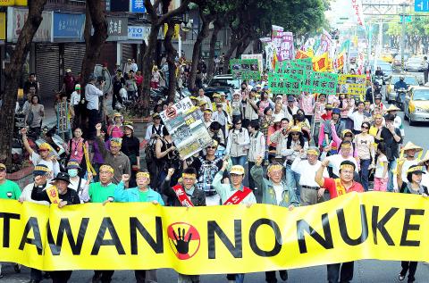 Thousands of people mobilized by several civic groups took to the streets in Taipei yesterday to demonstrate against nuclear energy and demand an immediate halt to construction at the nation’s Fourth Nuclear Power Plant.