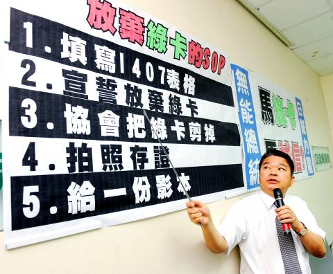 Several KMT politicians, including former Taipei County commissioner Chou Hsi-wei (周錫瑋) and KMT Legislator Lai Shyh-bao (賴士葆), had renounced their permanent US residency by following the standard procedure of filling out the I407 document and taking an oath, Tsai Huang-liang said, adding that Ma should do the same to resolve the issue once and for all.