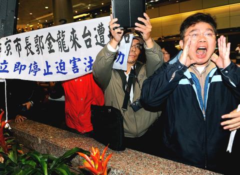 Falun Gong practitioners filed a lawsuit against Beijing Mayor Guo Jinlong (郭金龍), who arrived in Taiwan yesterday afternoon, saying he had committed crimes against humanity, including his alleged involvement in the torture and abuse of Falun Gong practitioners and Tibetans.