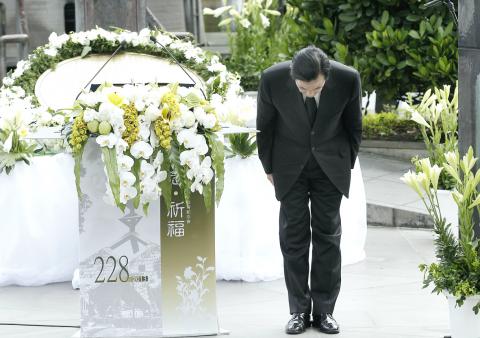 President Ma Ying-jeou (馬英九) yesterday bowed to apologize for the then-Chinese Nationalist Party (KMT) government’s crackdown on civilians during the 228 Massacre, and instructed the Ministry of Education to increase the amount of educational materials dealing with the incident to teach the next generation about the tragedy.