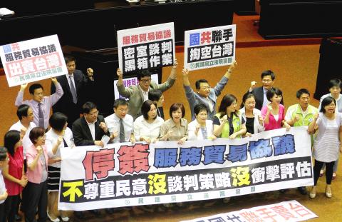 Pan-green lawmakers occupied the floor of the legislative chamber yesterday morning with placards reading “the Chinese Nationalist Party [KMT] and the Chinese Communist Party [CCP] are hollowing out Taiwan’s [economy]” to protest the cross-strait service trade agreement that was signed yesterday afternoon.