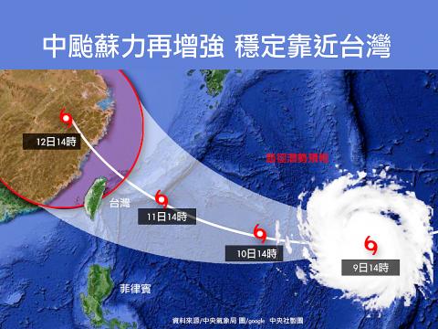 Daniel Wu (吳德榮), the former director of the bureau’s weather forecast center who is now an adjunct associate professor of atmospheric sciences at National Central University, said that Soulik’s force could continue to increase due to high sea temperatures, given that its structure has not been altered by terrain.