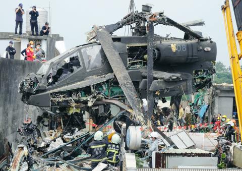 An army AH-64E Apache helicopter crashed into a residential area in Taoyuan County at about 10am yesterday during a routine training flight, slightly injuring the copilot. No one on the ground was hurt in the incident.