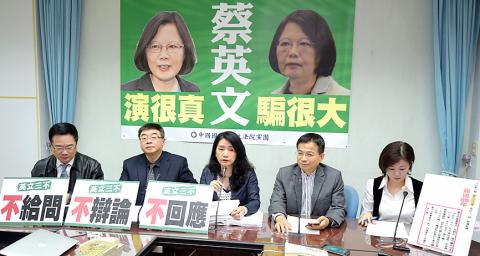 KMT Legislator Alex Tsai (蔡正元) said Tsai was “dodging cross-strait affairs,” which he said was “a scam,” as she could only “avoid answering sensitive questions by saying ‘next question please,’ talking nonsense, repeating herself and reciting statements.”