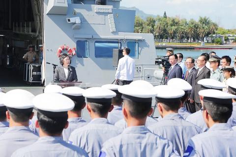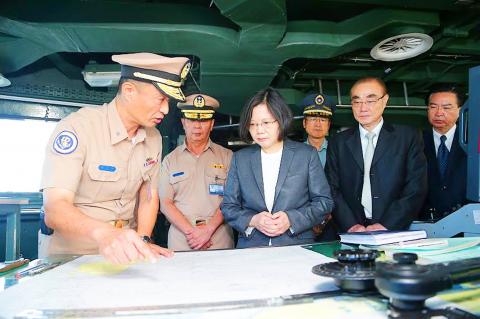 “Now, a greater mission has fallen upon your shoulders,” Tsai said, urging the navy to put its skills to use and sail to the South China Sea to safeguard the nation’s interests.