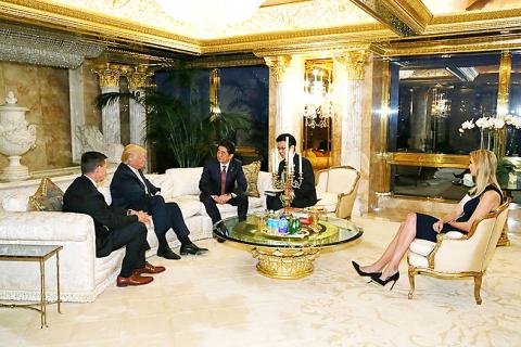 Photographs taken inside the ornate meeting room at Trump Tower showed Abe accompanied only by an interpreter and Trump by his daughter Ivanka, her husband and Trump adviser Jared Kushner, and retired US Army lieutenant general Michael Flynn, whom a senior Trump official on Thursday said had been offered the national security adviser position.