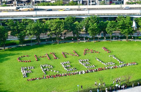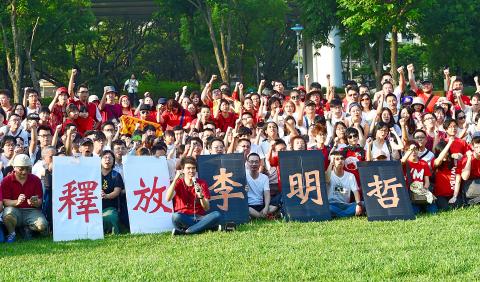 Dozens of people rallied yesterday to spell out “China! Free Li” in Zhongyangyiwen Park (中央藝文公園) in Taipei and calling on Beijing to released Taiwanese human rights advocate Lee Ming-che (李明哲).