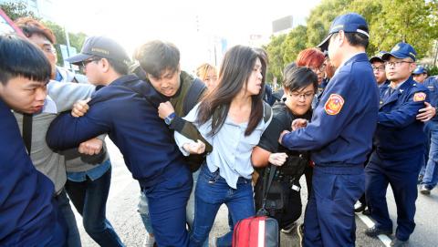 Several scuffles broke out between protesters and police when police tried to narrow down the demonstration area at the intersection between the Zhongshan N Road and Zhongxiao E Road.