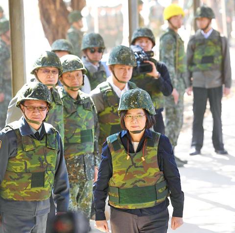Tsai yesterday spoke to military recruits after her tour of Taichung’s Chenggong Ling (成功嶺) military training camp, where she inspected live-fire sharpshooter practice and had lunch at the canteen.