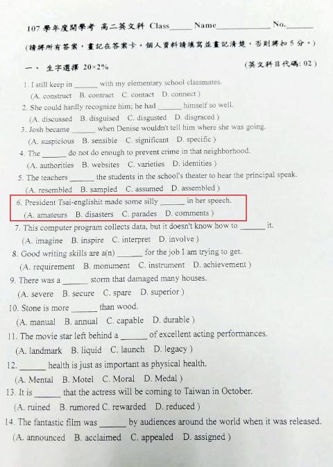 The fill-in-the-blank question, which appears on the test paper for the school’s 11th-grade students, reads: “President Tsai-englishit made some silly ____ in her speech.” Students were given four choices — amateurs, disasters, parades, or comments — to complete the sentence.