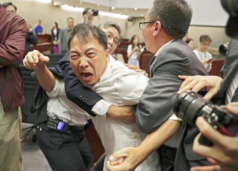 At one point, Wu Chi-wai (胡志偉), the Democratic Party chairman who tried to stop Shek from presiding over the meeting, shouted at him, saying: “Don’t be a sinner for a thousand years! Don’t sell out Hong Kong.”