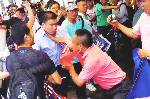 Taiwanese media broadcast footage of the clashes outside the Grand Hyatt, where Tsai is staying during her stopover.