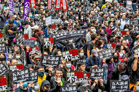 “It is sad that our demands from 2019 need to be carried forward to 2020,” the front’s Jimmy Sham (岑子傑) said at the start of the rally.