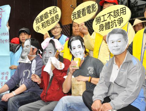 Members of the Taoyuan County Confederation of Trade Unions and factory workers who have lost their jobs hold up satirical signs and wear masks of President Ma Ying-jeou, Council of Labor Affairs Minister Pan Shih-wei and others outside the Taipei District Court yesterday to protest a 20-day detainment of their honorary chairman Mao Chen-fei after Thursday’s Workers’ Day protests. The protesters said the judicial system lets the elite off easily, but does not even allow workers to protest on the streets.May 04, 2013